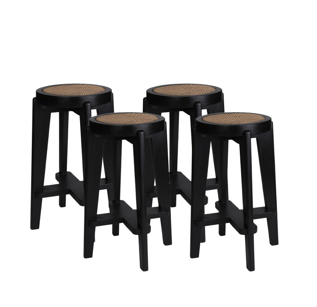 Inspiriert vom Chandigarh-Stil der späten 1950er-Jahre überzeugt dieses Set aus vier Cane Barhockern mit raffinierten Geflecht-Sitzflächen und einer klaren, eleganten Silhouette. In Charcoal Black ausgeführt, verleiht der tiefe, edle Farbton dem zeitlosen Design eine markante und zugleich elegante Präsenz—ideal für Bar oder Kücheninsel und perfekt für farbenfrohe Cocktails.