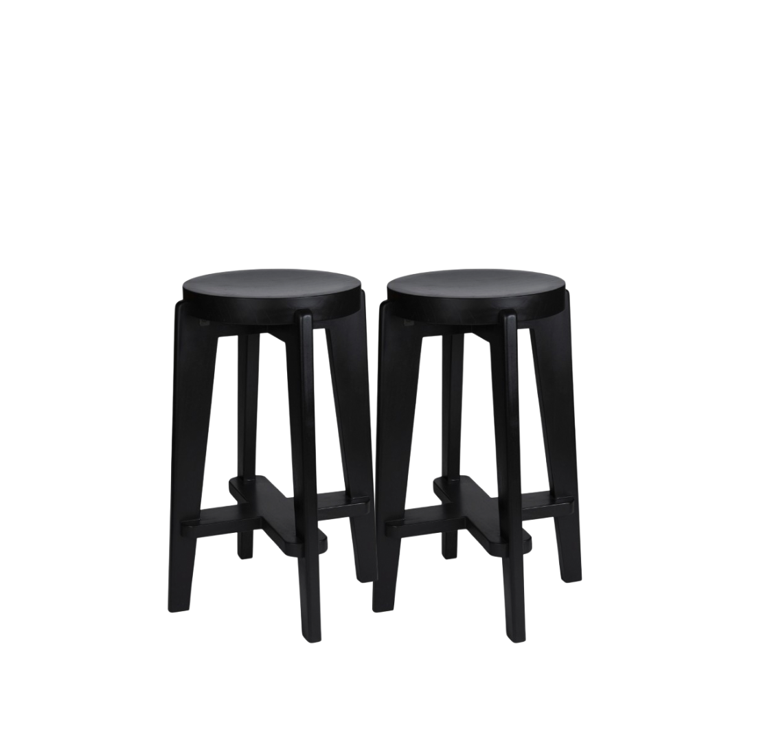 Inspiriert vom Chandigarh-Stil der späten 1950er-Jahre besteht dieses Set aus zwei hölzernen Barhockern mit massiven Holzsitzen und einer klaren, eleganten Silhouette. Die schwarze Oberfläche unterstreicht den tiefen, edlen Farbton und das zeitlose Handwerk, ideal für natürliche Materialien und eine stilvolle Barumgebung.
