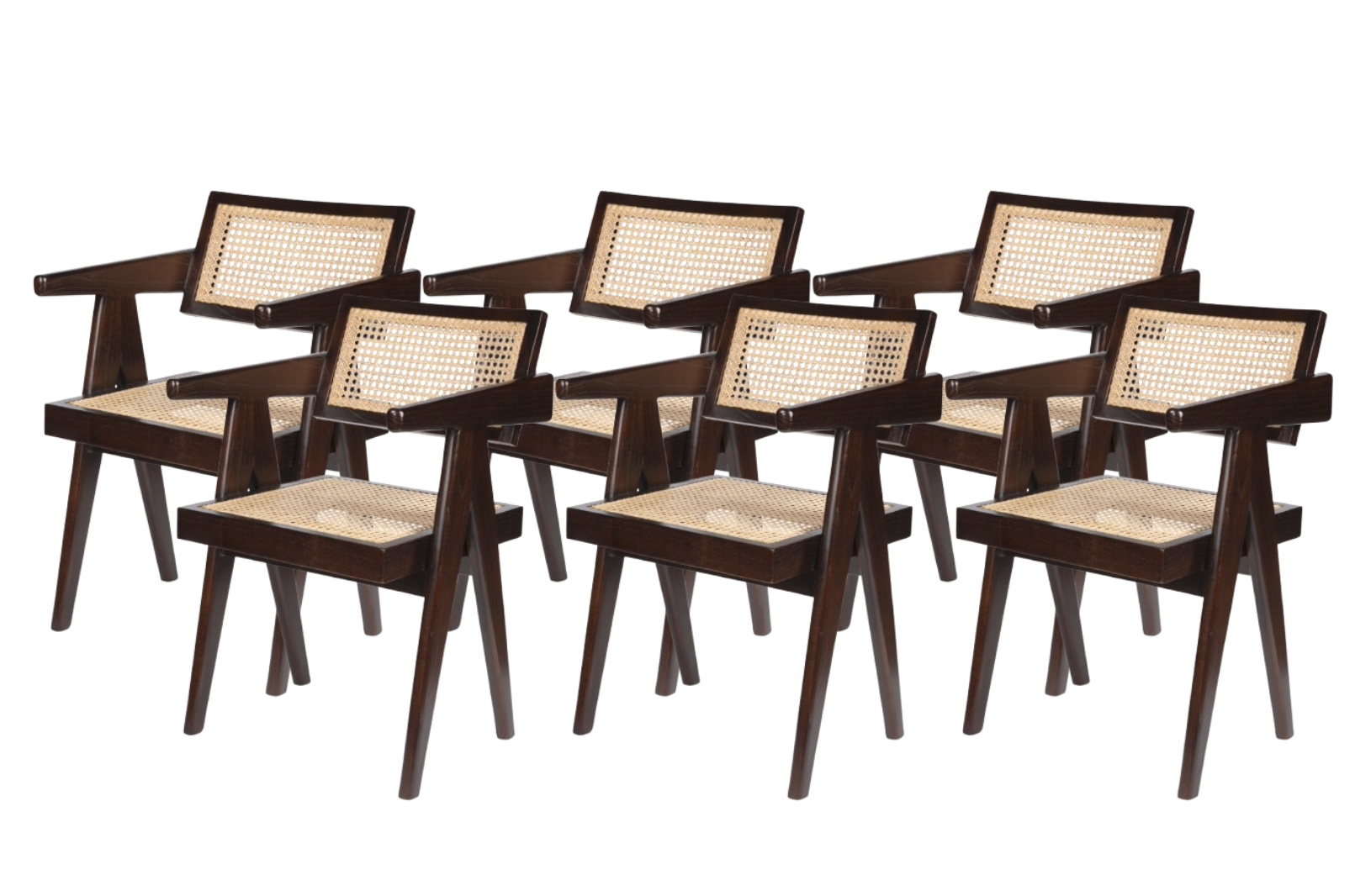 Renueva tu espacio con nuestro set de 6 sillas, inspirado en el icónico estilo Chandigarh de finales de los años cincuenta. Ideales tanto para oficina como para comedor, combinan un diseño atemporal con confort moderno. Acabadas en Chandigarh Heritage Brown – un tono cálido y elegante para cualquier ambiente.