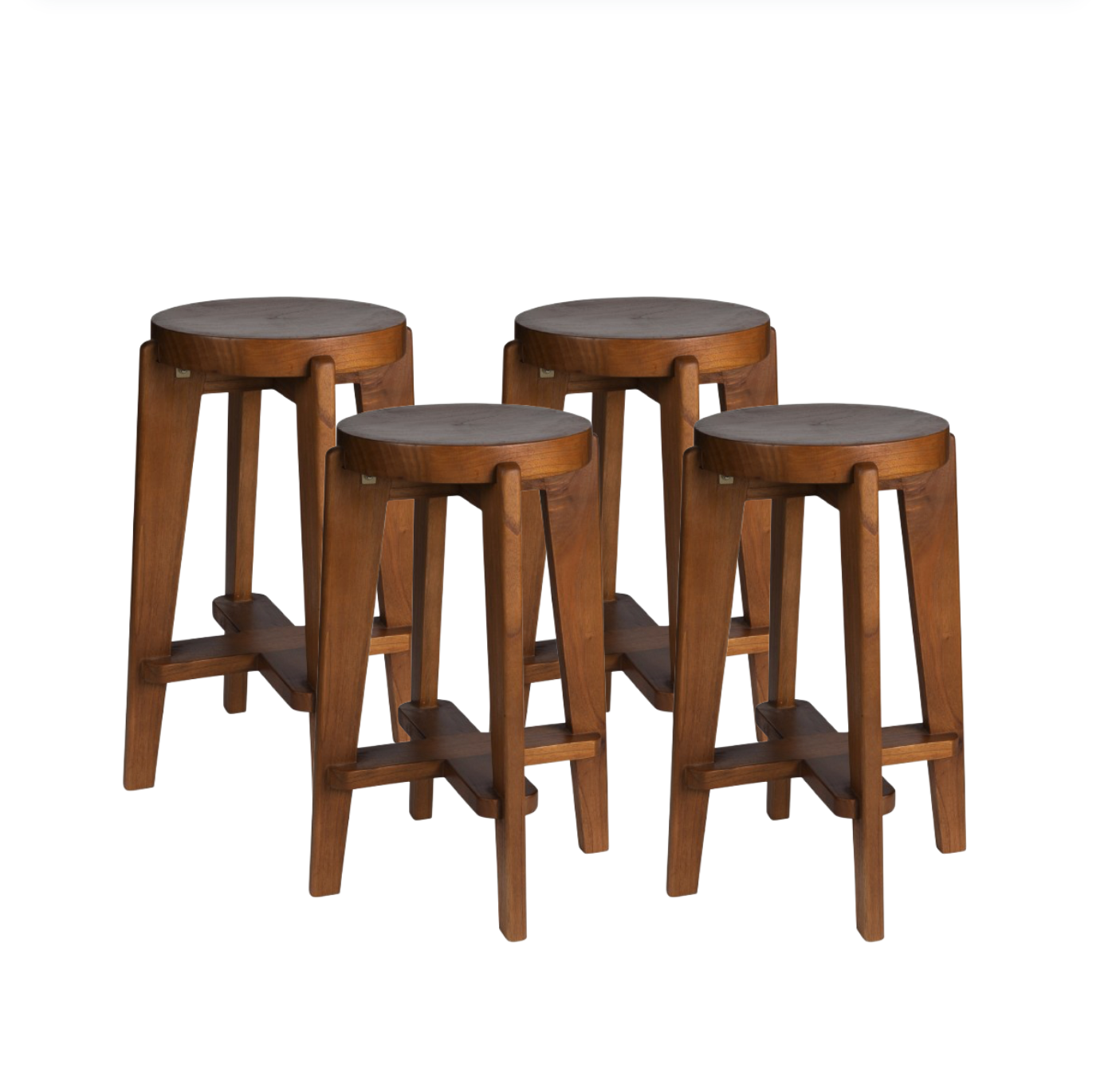 Myöhäisen 1950-luvun Chandigarh-tyylistä inspiraationsa saanut neljän puisen baarijakkaran setti koostuu massiivipuusta valmistetuista istuimista ja selkeästä, elegantista siluetista. Ruskea viimeistely korostaa ajatonta käsityötaitoa ja sopii täydellisesti luonnonmateriaaleihin ja tyylikkääseen baarimiljööseen.